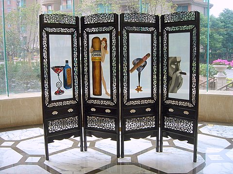 就像這屏風裡的內容物,那是很多正常男人無法抗拒的吧,美酒、美女、雪茄,權勢和名利,這些極西方現代的物慾圖騰,被極細工的剌繡在極古典中國的屏風上,看來竟然毫不突兀,反而有種另類的美感。