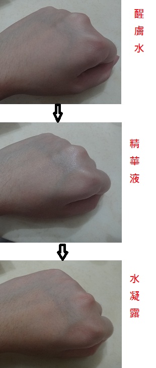 精華液呈透明液狀,但質地較醒膚水黏膩一些,但亦容易均勻推抹、延展性佳,推抹時有滑潤感,推抹後的肌膚有稍微黏黏的感覺,但沒過多久,肌膚有感覺些微滑柔感。