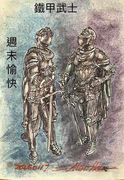 陪外孫視力檢查,見到一尊擺設的鐵甲武士,回家後畫成兩尊作伴。
