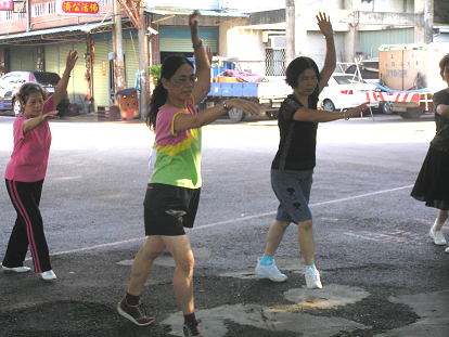 「左手舉起來,右手畫圈圈」。在前頭領隊喊著節拍的舞者,就是郭秀全老師。她一副瓜子臉,有雙美麗的大眼睛。她擔任舞蹈老師有兩三年了。但她跳舞,總共跳了十七年。每天,她都很早起床。因為跳舞身體會健康,是一項很好的運動。