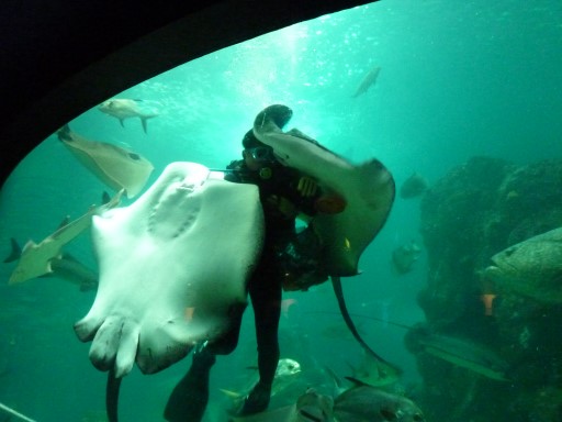 用過早餐,就往澎湖海洋資源館奔去。一進門,三隻大海龜拍打著魚缸玻璃,向我們熱切地招手歡迎。這裡不輸台灣本島的屏東海生館。尤其是餵食秀,好不精彩,只見水中迅速飛掠過數隻魟魚,如美國著名的黑色隱形轟炸機B-2來襲,把潛水員團團包圍、層層包裹,竄動爭食。