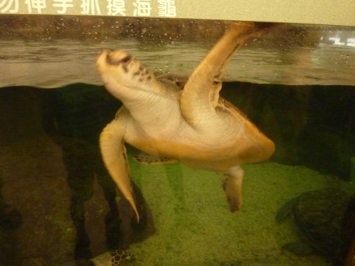 後來聽了解說才知道,門口那三隻大海龜使勁拍打著魚缸玻璃,根本不是迎賓,而是因為太肥,館方進行減肥措施,牠們氣得拍打玻璃表示抗議。
