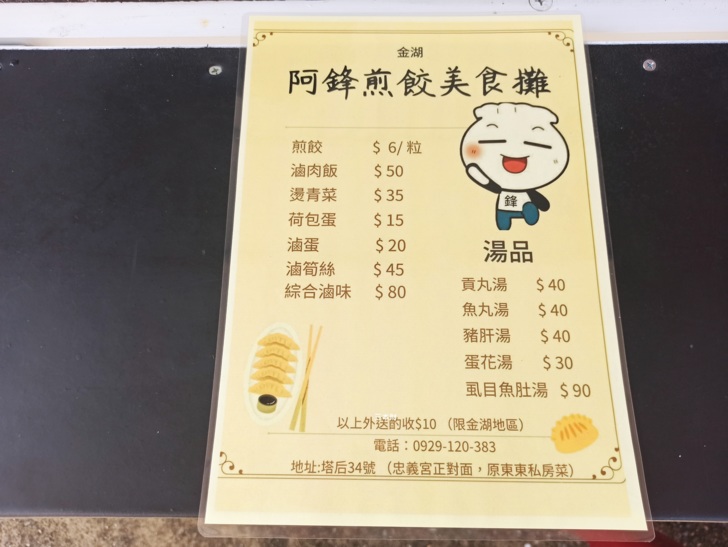 【金門‧金湖食記】阿鋒煎餃美食攤~午餐~營業時間、訂購電話、菜單價目表、公車及交通資訊