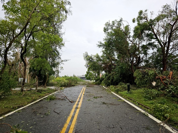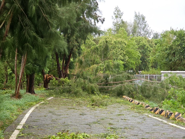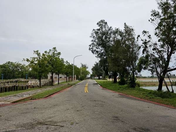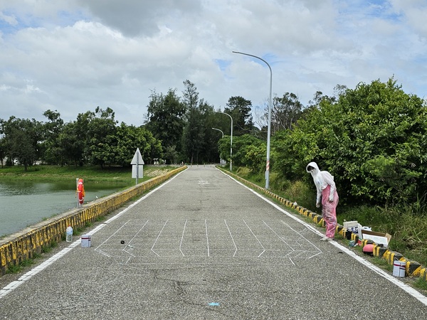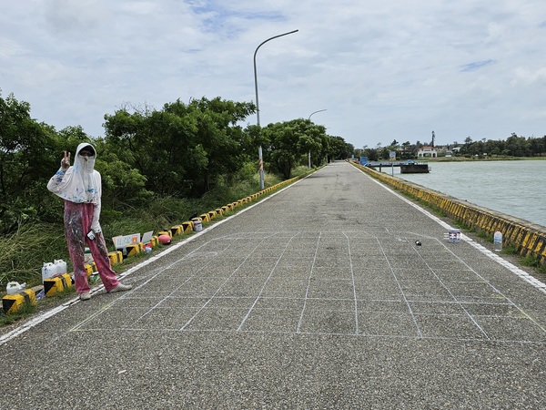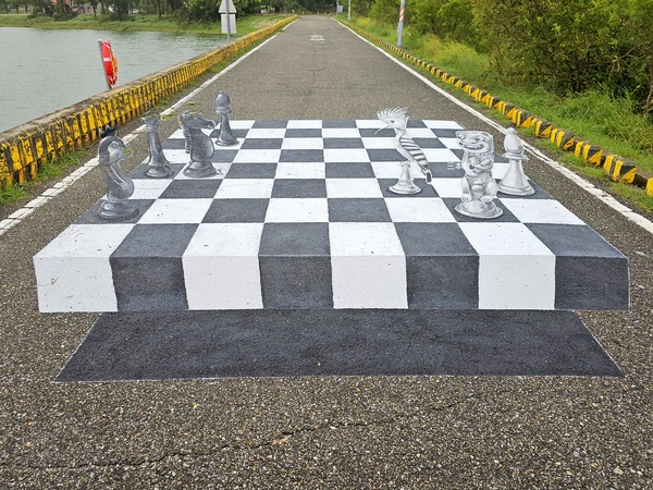 近幾年金門地區出現為數不少的3D彩繪,這些作品大都出自〝薏米emi牧田創意彩繪工作室〞的廖駿杰和陳詩薏夫妻之手,繼〝漂浮斑馬線〞、〝獺上太湖〞之後,前幾天又有一新作品〝西洋棋盤〞呈現在大眾眼前;其實幾天前我約了山外田轎仔前往星巴克之前路過太湖淨水廠時,曾無意中看到陳小姐獨自1人在地上打稿,當時陳美女告訴我預計3個工作天完工...前天下午颱風過後我跟田轎仔再次路過太湖時就看到完工後的〝西洋棋盤〞,其實當時的路況有些不好走也沒有遊客,前往榕園跟西洪營區的路都被倒下來的路樹給阻擋,來到西洪營區前我跟田轎仔都傻眼了...