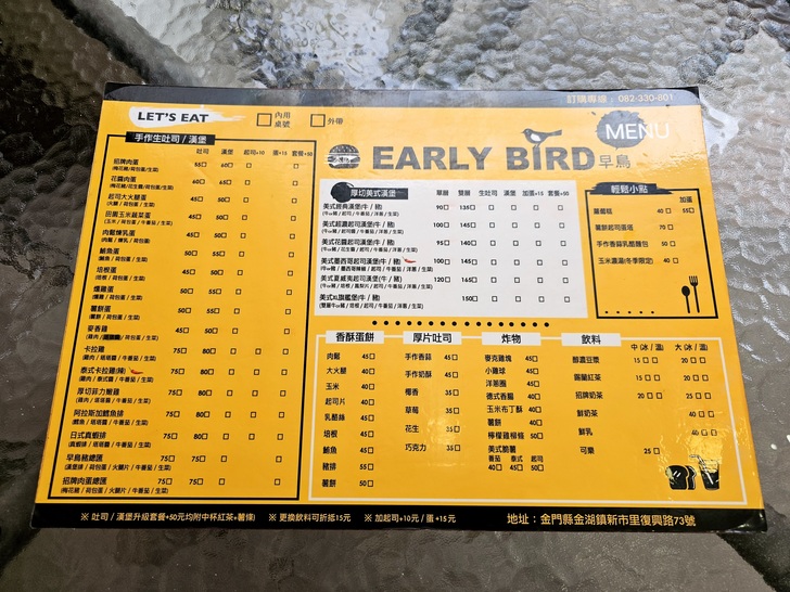 在金門,您可以吃到傳統在地的早餐、也可以吃到不少西式連鎖的早餐,如果您想要選擇性多一點的話金城地區的早餐店是最佳的選擇!Early Bird早鳥早午餐位於金湖市區的復興路上,這一天我到山外洽公時原本想約山外田轎仔區一同吃早餐,只是當我打電話給田轎仔時他告訴我人在廈門沒空...