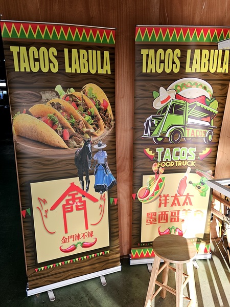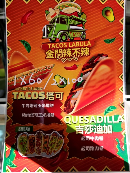 今天山外地區的金湖鎮公有零售市場新開了一家賣墨西哥美食的攤位,金門辣不辣Tacos Labula應該是店名!如有寫錯也不吝告知!前幾天在臉書社團裡看到店家預告原本昨天要開始營運,後來因為準備不及而改到今天開始試營運,下午上門時看到菜單上提供的Taco跟Quesadilla,點餐時老闆告知今天只有Taco塔可...