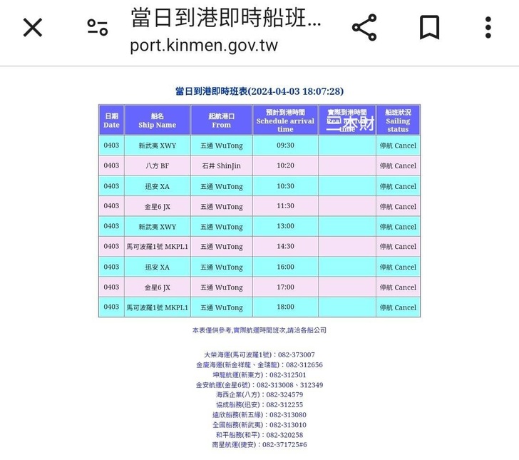 今天小三通船班全數取消