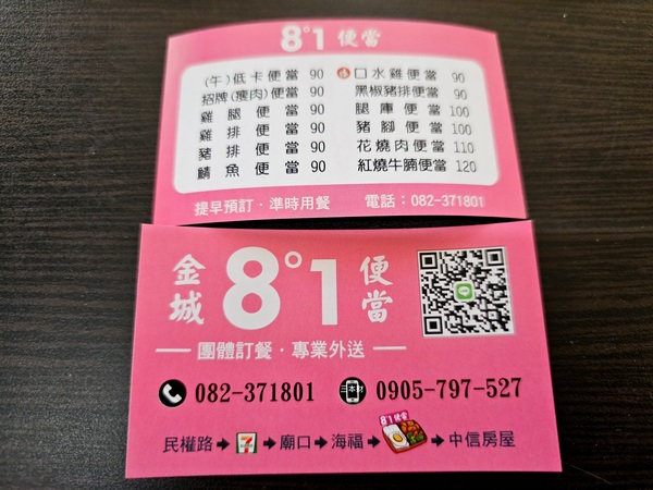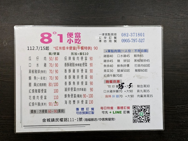 或許是為了試探市場4年前剛開幕的時候店家是從早上6點就開始營業,當時中式早餐提供了:炒麵、炒米粉、貢丸湯、豬血湯、大腸豬血湯、香菇肉燥飯,午晚餐時段還有提供便當,更特別的是店家還接受支付寶及微信支付的付款方式;只是後來碰上疫情業者改變經營模式改以便當為主,辦公室的同事有時會叫這家的便當,8°1便當店位於民權路上附近著名的地標物是位於金帝飯店與中信房屋的旁邊,通常我都是趁中午的休息時間上門用餐...