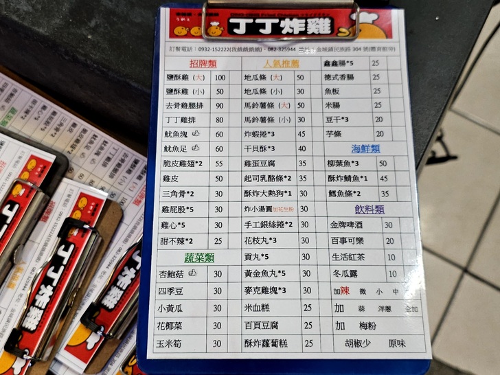 平民美食的炸雞在金城地區也是屬於一級戰區!因為市區有不少家自創品牌或連鎖炸雞店;丁丁炸雞原本位於金城市區的環島西路1段也就是康是美的附近,店家在2021年7月將炸雞店從環島西路搬到了民族路也就是體育館的對面,附近的地標物就是過了牛家莊還沒到南門天后宮...