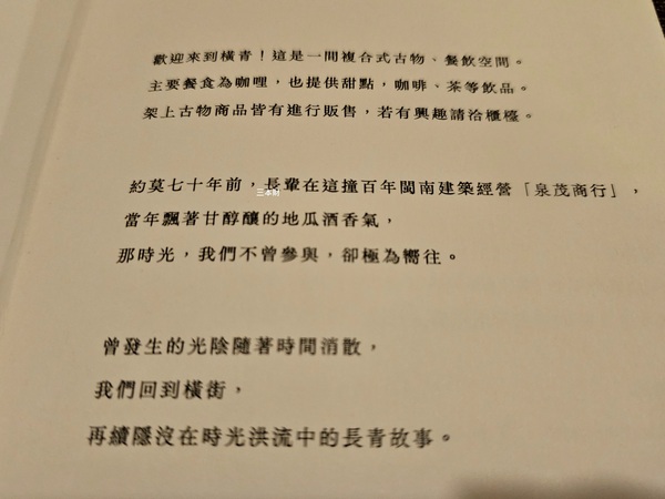 橫青商行位於金城市區中興路隱密的小巷弄裡,是一間複合式的餐飲店,從店家菜單上的介紹:70年前這裡曾經有間〝泉茂商行〞,店內有不少的古物也是一間非常適合拍照的古物店,架上的商品店家也有提供販售,這一天我在市區閒逛時無意間逛到這裡,當時適逢店家休息所以改到晚上再上門...