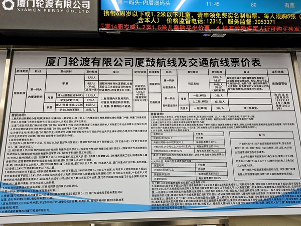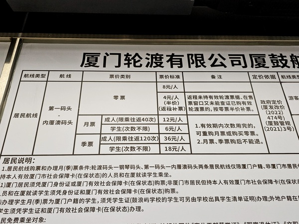 第一碼頭前往鼓浪嶼內厝澳碼頭的居民票價表