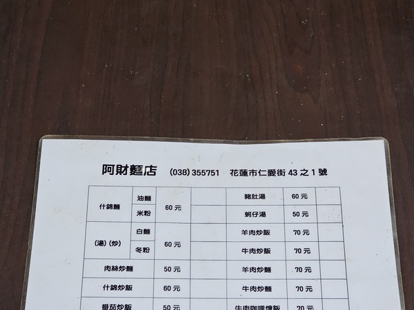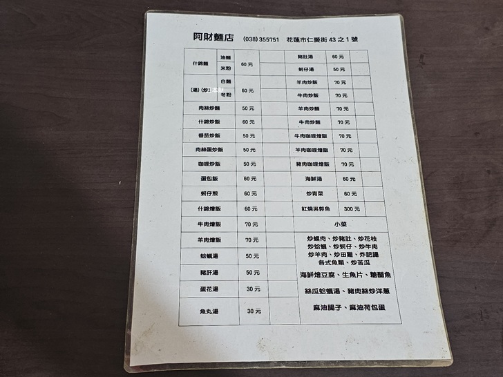 阿財麵店花蓮在地老字號的小吃店,您在這裡幾乎看不到觀光客上門用餐,會知道這間麵店是跟花蓮好友喝咖啡時知道的,當時好友告訴我他已經吃了好幾天阿財麵店的東西要我自己上門去吃招牌什錦麵;第一次上門時花蓮下起大雨,雖是雨天但客人還是絡繹不絕的陸續上門,我找了個空檔跟年過80的老闆聊天老闆告知:麵店最初開在節約街市農會那邊,民國58年時他花了1800元頂讓下來,當時租金一個月400元,一碗麵賣3塊錢,現在只有他一個人所以縮短營業時間,以前最晚曾賣到凌晨2、3點才收攤!看了一下菜單肉絲炒麵、番茄炒飯、肉絲蛋炒飯、咖哩炒飯只賣50元,我點的什錦麵一碗60元,憑良心說阿財麵店的價位真的便宜...