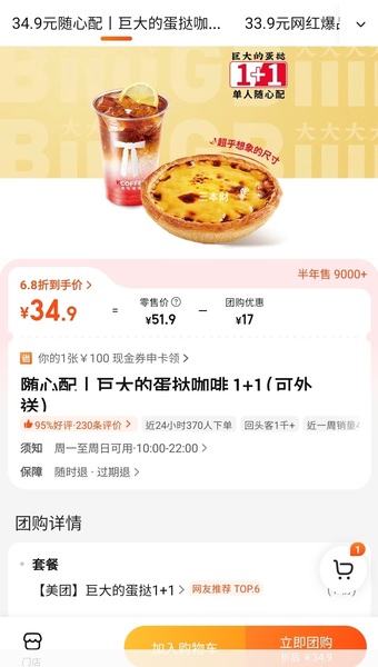 巨大的蛋撻咖啡套餐34.9塊/折合台幣大約148.01元