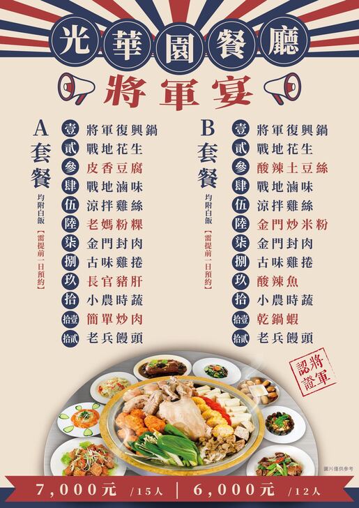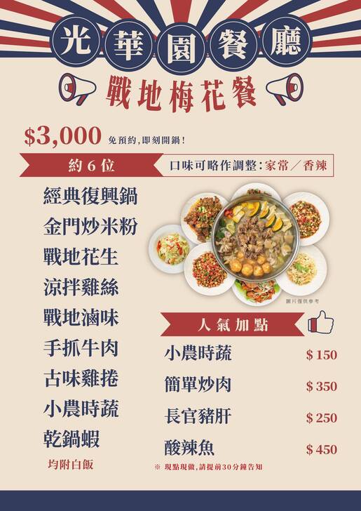 位於金湖鎮太湖旁的光華基地設立於民國58年/1969年,是早年金門地區為數不多的空飄站之一,後來解除戰地政務後於民國86年/1997年走入歷史!整修前我曾造訪過光園基地以及一旁的心戰資料館,雖然當時已經裁撤但資料館內還是能看到不少有關於空飄、心戰等資料及照片,後來再看到時已經快拆光了;這一天山外田轎仔來電相約到昇恆昌星巴克喝咖啡,喝完咖啡後我們就順道到附近的光華園,沒想到翻修後的光華園從原本的空飄站搖身一變成了光華文創,園區裡還有一間光華園餐廳,餐廳分成2個部分:一般大廳及包廂區,5間包廂分別以:伯玉廳、玉章廳、安祺廳、多年廳以及生明廳來命名,值得一提的是餐廳兩側有超過40個曾在金門駐防部隊的三角標誌,讓上門用餐的老兵們可以簽名留念...