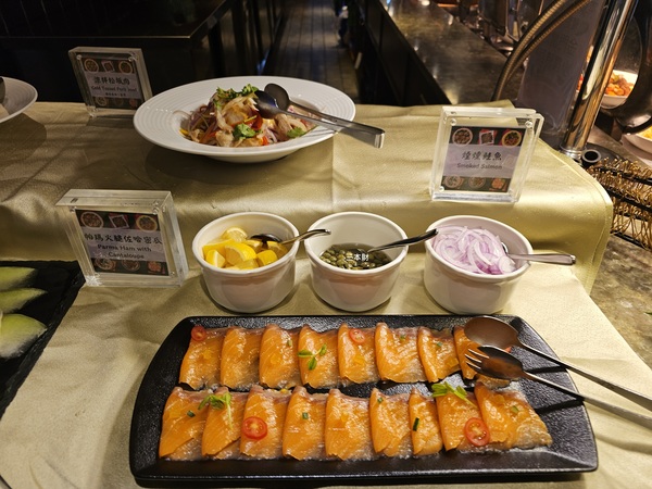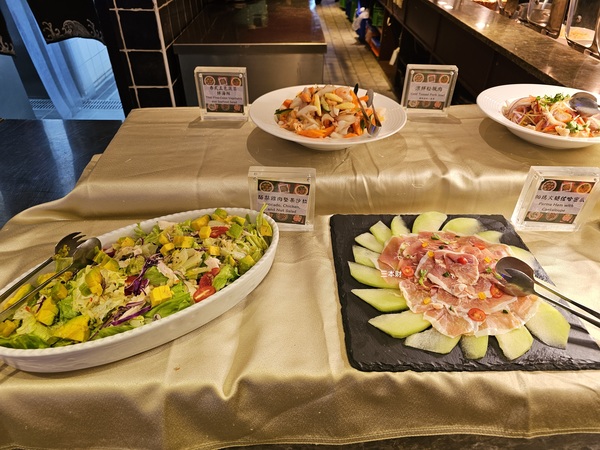 泰式五色蔬菜拌海鮮、酪梨雞肉堅果沙拉、帕瑪火腿佐哈密瓜