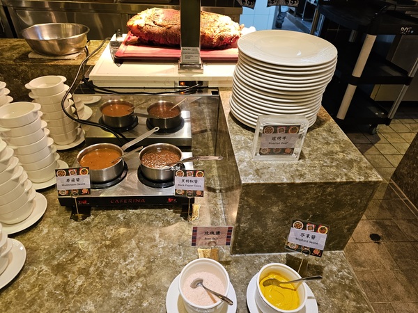 爐烤牛、蘑菇醬、黑胡椒醬、玫瑰鹽、芥末醬