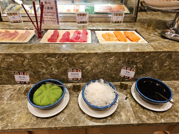 鮪魚、鮭魚、哇沙米、白蘿蔔絲、醬油