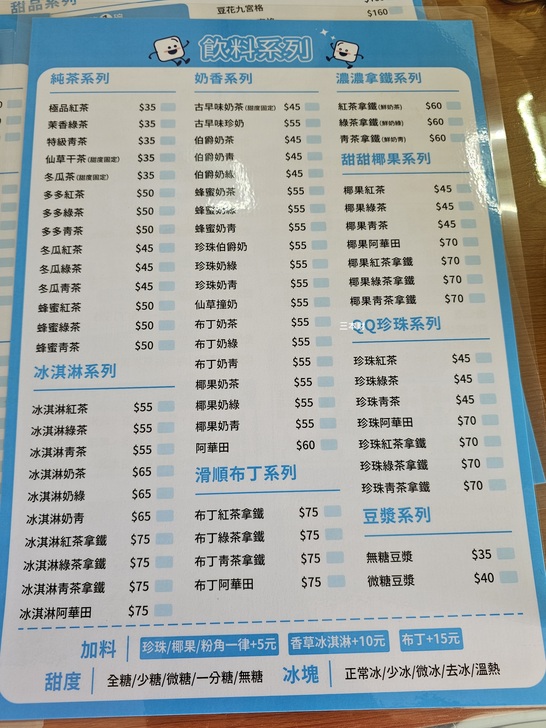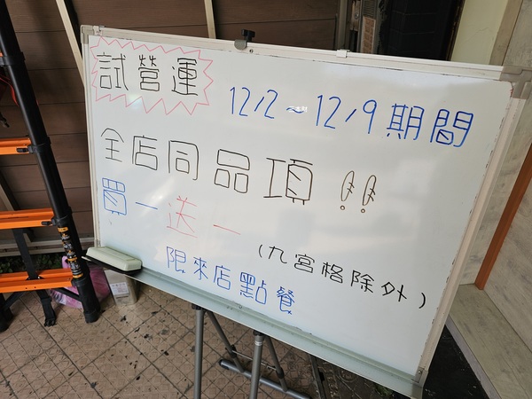 吃完市港自助餐後我跟田轎仔來到馬路對面這間剛剛正在試營運的豆樂冰飲鋪購買冰品,來到店門口會看到店家推出試營運的促銷活動看板:12月2日~12月9日一連8天全店同品項買一送一,九宮格系列除外/限來店點餐,豆樂冰飲鋪菜單提供的餐點有:嫩仙草、豆花、黑糖刨冰、九宮格系列、金門特色系列以及一整面的飲料利列,雖然店家有提供內用但我們選擇外帶...