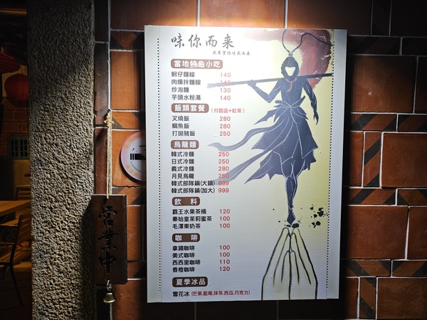 今天傍晚在臉書社群看到店家的Po文得知瓊林新開了一間餐館,下午開始金門颳起風氣溫也逐漸下降,打了好幾個電話同事或好友下班後紛紛跑去吃火鍋;味你而來餐館位於瓊林保護廟旁、前身是〝瓊林客棧〞!看到店家的留言這間餐館是〝冰容相見〞開的分店,來到門口看了菜單店家目前提供的餐點有:當地特色小吃、飯類套餐、烏龍麵、飲料、咖啡及夏季冰品...等餐點