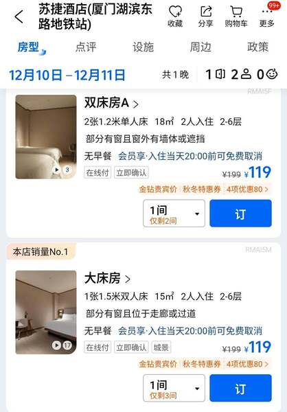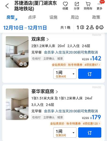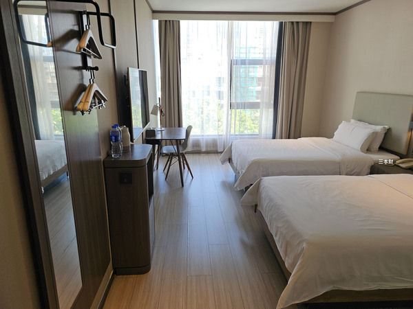 某一天滑手機時瞄到蘇捷酒店湖濱東路地鐵站店,第一眼看到照片時覺得有點眼熟!好奇的我點了酒店相冊一看我才得知漢庭酒店湖濱東路地鐵站店已經易主;從漢庭酒店變成蘇捷酒店最大的差異大概就是房價,之前漢庭經營時最便宜的房假隨便都200塊起跳,上一回我跟好友入住廈門蘇捷酒店雙床A房那時訂到一晚130塊,房價便宜且客房乾淨,剛剛用手機查詢明天最便宜的雙床A房只要119塊人民幣/折合台幣大約532.76元,1大床+1小床的豪華家庭房則是179塊/折合台幣大約801.38元,且入住當天18:00前還可以免費取消...