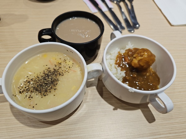 玉米濃湯、小時厚奶茶、咖哩飯