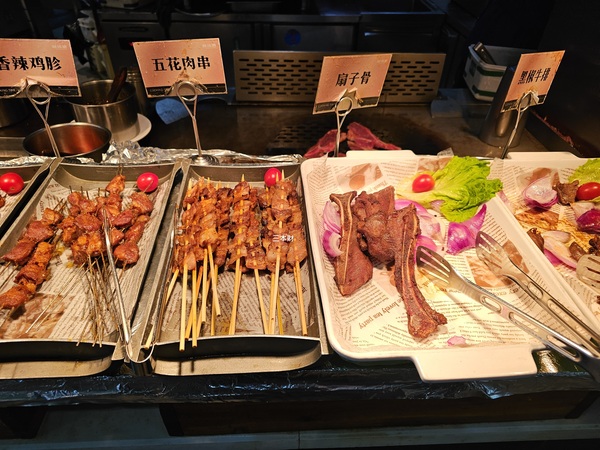 香辣雞胗、五花肉串、扇子骨、黑椒牛排