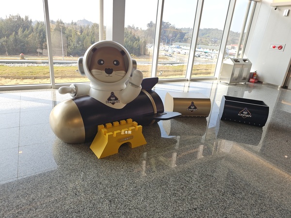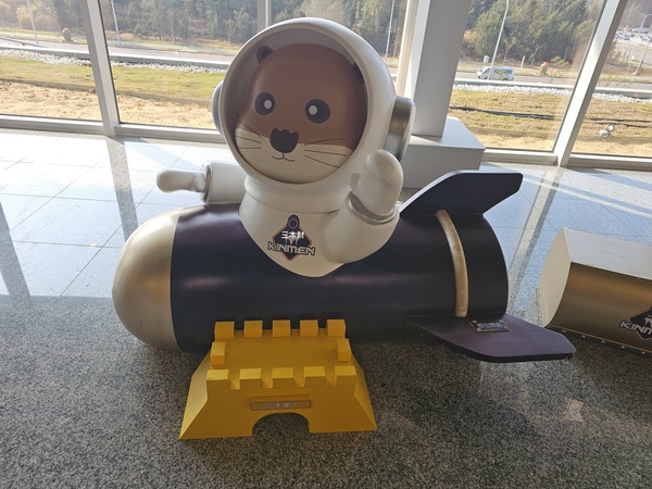 當天我們一行人在離港大廳轉了一圈後隨即準備過安檢進入候船室,相比之前的水頭碼頭金門港旅運中心安檢是一直線不需要繞來繞去,通關之後您會看到眼前ㄇ字型的免稅商店,左側商品服務中心區有免稅店的服務櫃檯:風獅爺免稅店、金坊免稅商店、昇恆昌免稅店,一旁有個坐在火箭造型裡的金門阿特及烈嶼地標之一的八達樓子...