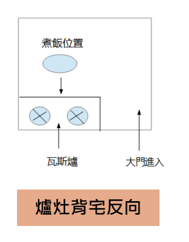 [爐灶背宅反向 財運擦肩而過],以前叫爐灶,現代稱為瓦斯爐,如果你家的瓦斯 爐與大門的位置相反,或是背向,等於[爐灶背宅反向]的意思,也代表是女人當家,掌控家裡錢財的權力也大,但是否一定財運擦肩而過,我有不同的看法
