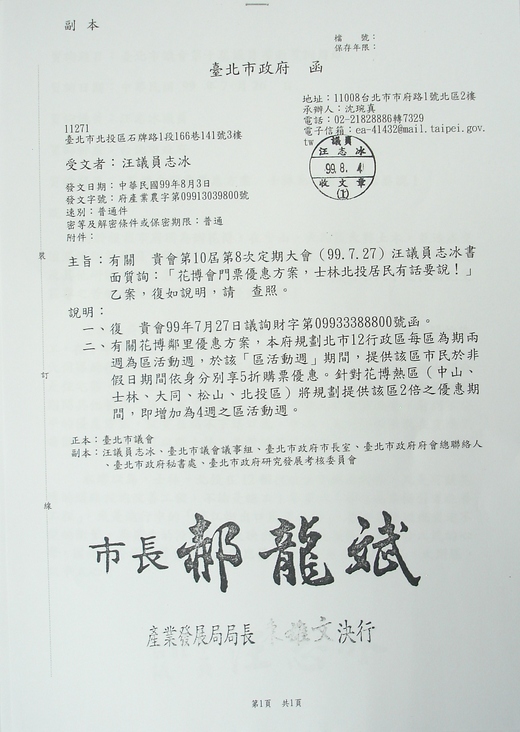 市府函覆花博優惠方案公文~~