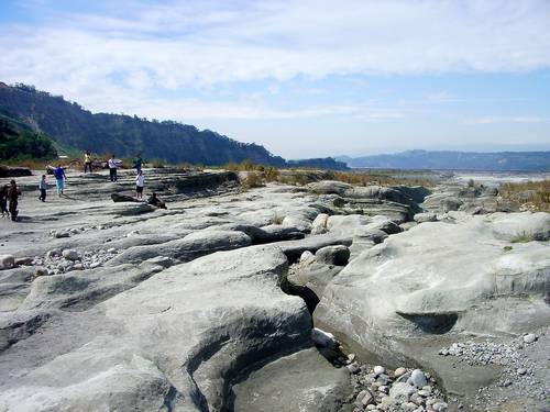 感謝老天眷顧,溪床由於連日無雨乾涸,我們不須「涉水」而過,也無須橫越一處寬約20公尺的「沼澤」,首先映入眼簾的是像月世界般陣陣隆起的頑石巨岩,再往前「跋涉」約20分鐘後,最後終於「抵達」雄偉壯闊的大安溪大峽谷,雖然占地面積沒有美國大峽谷來得廣闊,但是卻也是值得一探究竟的峽谷奇觀。聽說是921地震擠壓河床隆起,經河流切蝕沖刷而成的。裸露似軍艦般巨大的岩層有著深淺不一、令人驚嘆的歲月刻痕,只可惜連日無雨,無法一窺迂迴曲折、高高低低的峽谷與谷底碧綠清澈的潺潺溪水相互揮映的激盪風情畫。