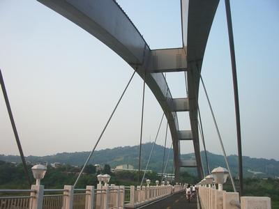 是以老殘在一天的修養生息之後,在綠廊的地利與風和日麗的天時再加上友人同行的人和之下,竟又動了「駕馭」單車之凡心,一行人直奔國道四號豐原端的自行車道起點(【源豐宸租車】就在下交流道處,可免費停車,服務態度也挺好)。雖然開始「起步」5分鐘後,老殘便萌生打退堂鼓之意,但唯恐壞了友人欲挑戰終點的高昂興致,於是沿途以拍照與小解為由,一路騎騎停停、吃吃喝喝,就這樣一邊自我催眠地竟也給騎到了4.7公里的石岡車站...6.0公里的情人木橋...7.4公里的梅子車站...8.0公里的東豐鐵橋...11.3公里的虹橋...然後...然後...然後...﹝僅文字回想竟也快氣喘噓噓起來...﹞終於給老殘騎到了終點12.0公里的客家文物館...真是感謝老天眷顧...呼~
