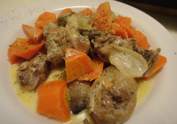 雞腿一隻切塊,洋蔥半個切塊,胡蘿蔔半個切滾刀塊,鮮奶油100cc.,雞高湯或水適量,月桂葉一片,百里香適量,鹽,胡椒適量。