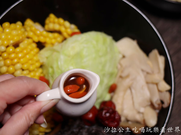 附上一杯枸杞酒,到桌邊時服務人員有幫忙均勻倒入