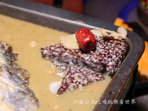 燒酒雞烤魚旁邊還放上米血,米血吸收高湯吃起來軟Q厚實,味道還不錯,切的蠻大塊的,有飽足感
