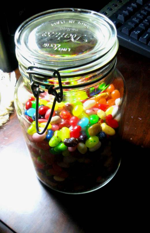 書桌上有一罐糖豆(Jelly Bean)