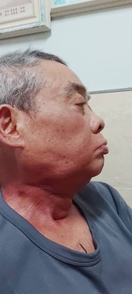 (高醫曾良鵬醫師是我這次手術的主治醫師,舌頭割除3分之2,再由整形外科割左大腿肉來接縫補舌頭,真的要相信現代的醫療團隊技術優良。曾醫師看我的電療紅腫的口腔發炎和頸部,他也不忍心我受苦,勉勵我這是過程要忍耐!)↑↓