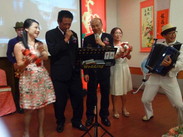 《雙方親家上台唱歌、兩位親家母搖鈴配樂,這種歡樂氣氛自然形成,都是因為今晚主持人-陳紀揚的誘導。有他-這個喜氣場面就會自然更熱鬧。》