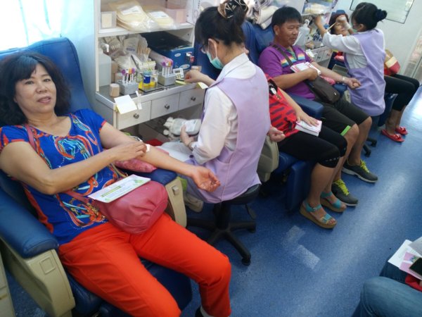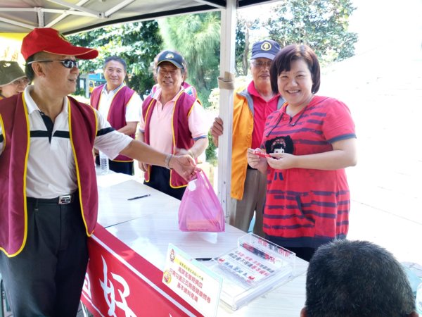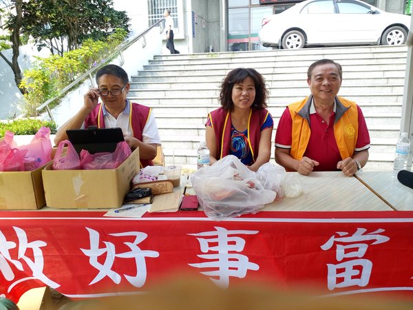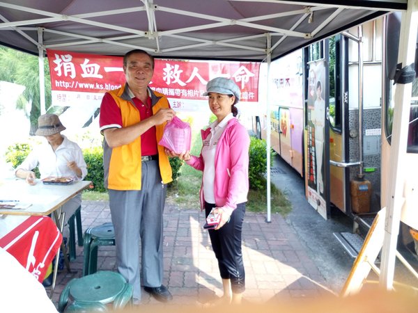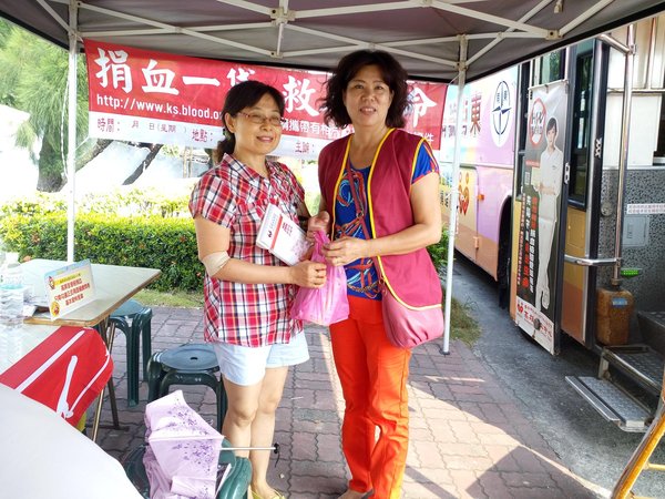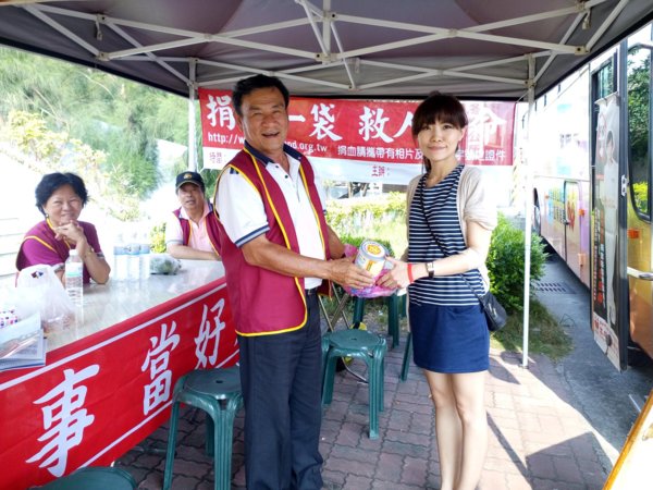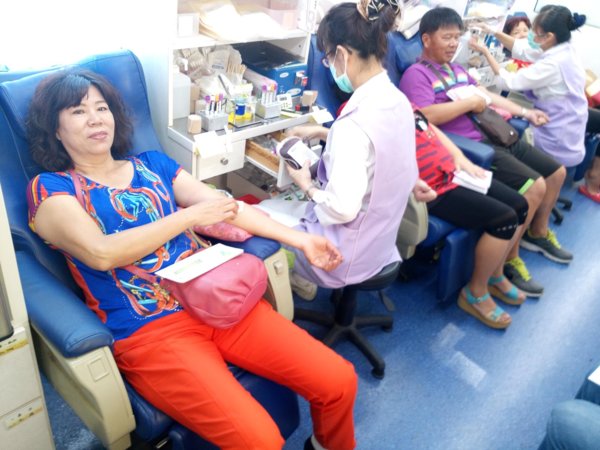 尤其在場的協會-吳景專理事,受到了感動也主動填表上了捐血車,完成面談後躺在捐血椅上,很勇敢的捐血兩袋500CC,平常就熱心公益擔任義消的她,捐完血還幫忙服務,真不愧是巾國英雌、好人好事的模範。