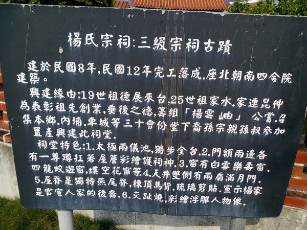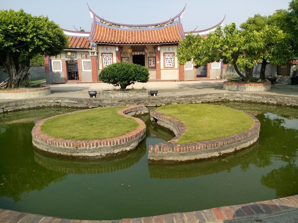 《首次來到佳冬從路邊見到嚮往的-楊家古厝指標,這也是我妹婿的宗祠,趁機借機車來探訪,果真見到這幅祠堂前的太極池,可惜大門鎖著不能入內參觀。》