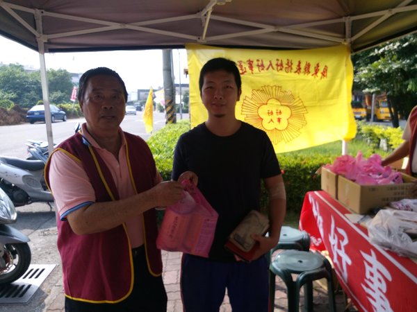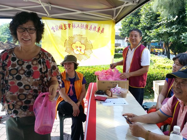 《總幹事一早就騎機車到現場布置-好人好事協會會旗,又擔任志工發送結緣品》