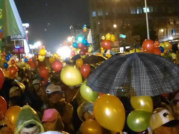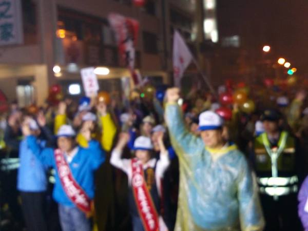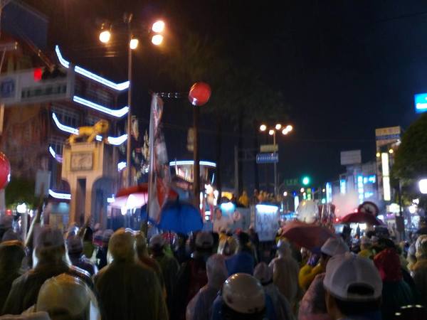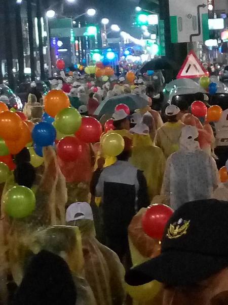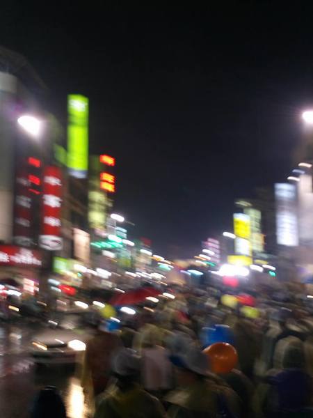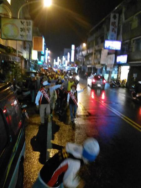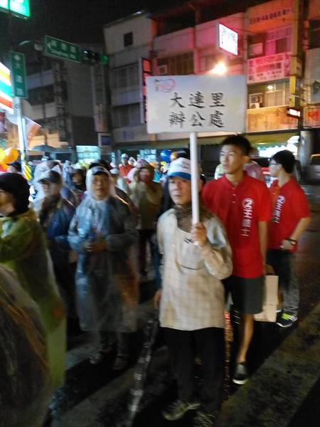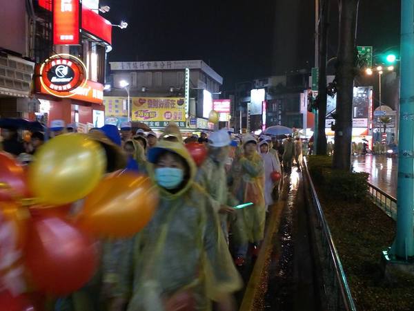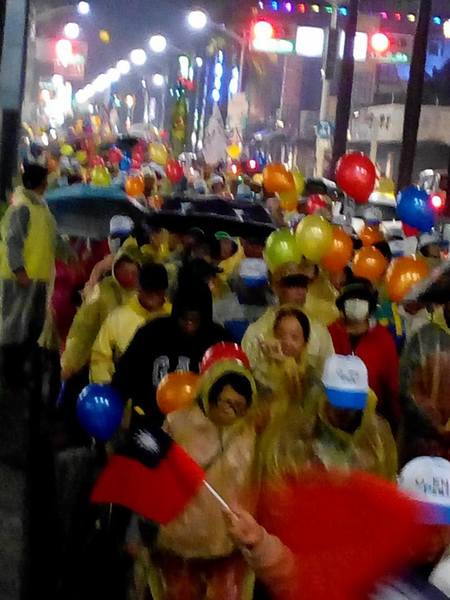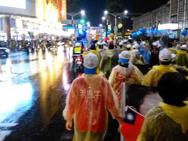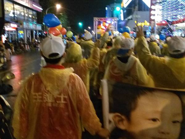 1/13日晚上7點支持王進士-千禧公園集合的遊行,真是所謂的「寒雨中見真情」;開始時雨仍下著,熱情的民眾披上輕便雨衣,就是要來參加遊行支持受敬愛的~2號王進士。沿途站出來揮手和放鞭炮的情景增多了,他們真的是被市民雨中遊行所感動了。