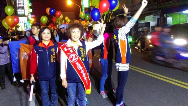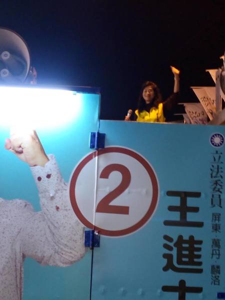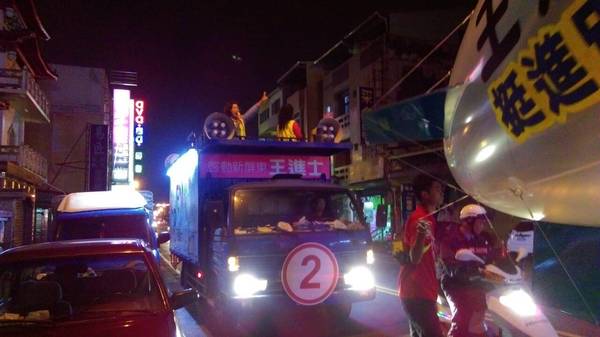 《今晚天氣有點冷,美麗熱情的陳美瓊縣議員,以她甜美的聲音站在宣傳車上廣播支持王進士,使得遊行活動增添熱情。》