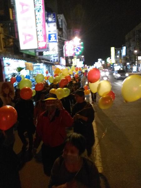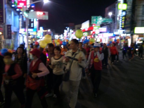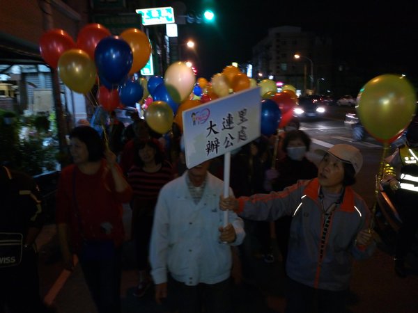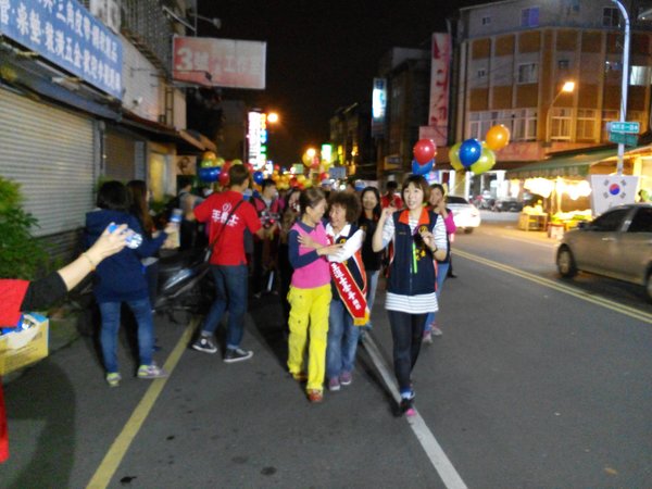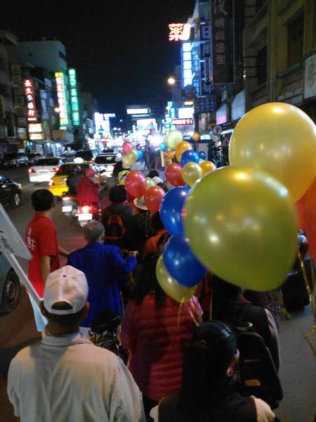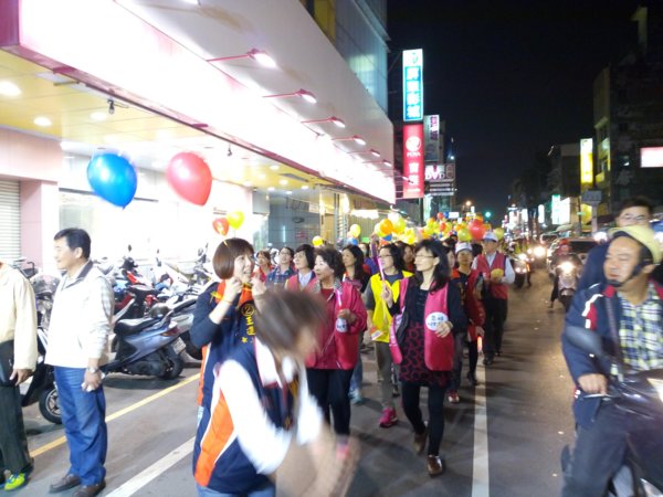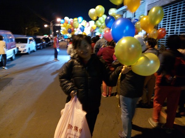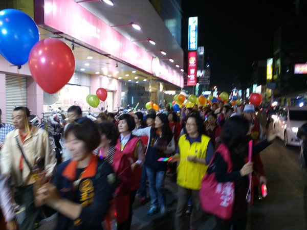 《1/8從今晚開始王進士立委競選總部推出-『挺進大遊行-好士作伙走』,我趕著晚上7點到達競選總部,拿著五彩氣球飄揚綿長的隊伍已經啟行了,我跟著民眾在後面走,有民眾分出了兩顆汽球給我拿著,大家都是自願來挺王進士參加遊行,我也遇到同事、同學、里民、網友、師姐們,邊走聊起「王進士」都是抱著感謝歡喜的心情來相挺,這才是真情發自內心的行動。而我則是衝著王進士立委沒看輕我只是基層警察,這麼久了偶而相逢還能叫出我-廖警官,〈退休9年了他還記得我-還給我升了官階〉,哈,這就是讓我感動的支持力量。》