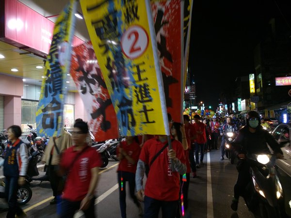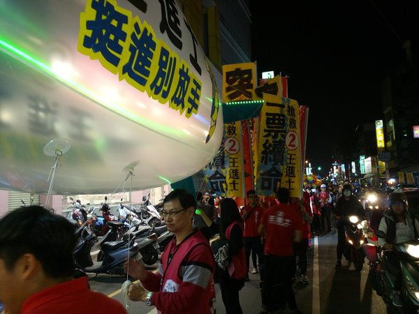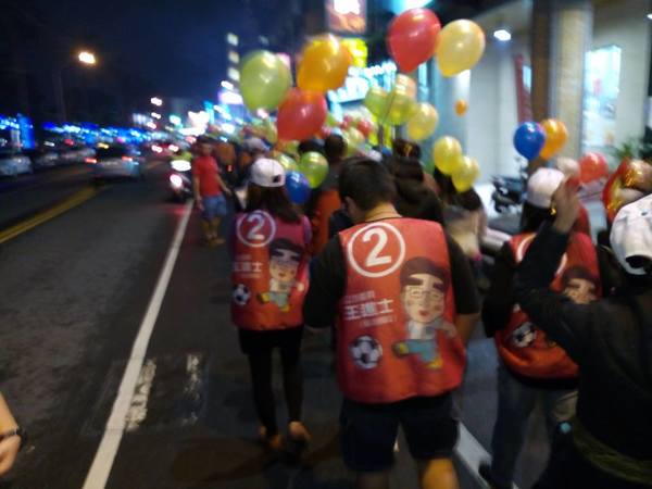 雖然今天氣候寒冷,但是挺王進士的熱情暖和了氣溫,我們很有秩序走在市區,拿著氣球比2號、喊2號,王進士當選。