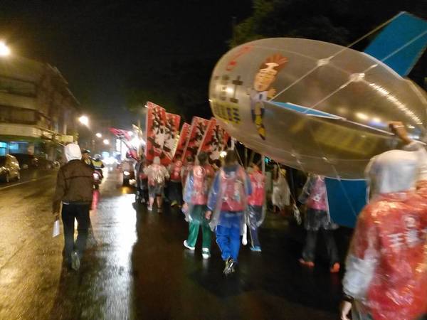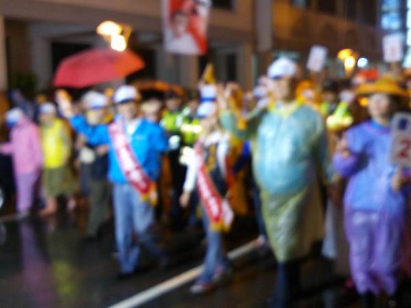 熱情的民眾披上輕便雨衣,就是要來參加遊行支持受敬愛的~2號王進士。