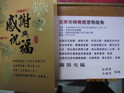 《來到會場內已經爆滿,外面還站著好多人,屏東市有這麼多三清會員讓我太驚訝了!原來大家是來出席伍澤元家族舉辦的鄉親感恩會。提起已故的伍澤元,他是民國85年的屏東縣縣長,在他任公職期間位屏東縣爭取了很多建設,可惜擔任縣長2年因故下台最後病死他鄉。 至今屏東人仍然感嘆著:『假使伍澤元繼續任職,屏東的建設絕對是誇目相看的,屏東人無福氣啦!』。