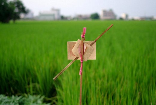 台灣由於氣候適宜一年可以有兩次收成,進入秋天,道路兩旁的稻子都已經長得很高了,期待的中秋也將要蒞臨,更期待的是田間土地公柺杖的出現──傳說中秋節是土地公的生日,樸實的農民會體貼的為土地公準備柺杖,感謝土地公一年來的庇祐,讓農作物躲過風災與蟲害,風調雨順為每一期的稻作帶來豐收。