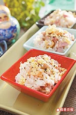 準備:香菇汆燙後與臘腸、火腿、煙燻起司各切丁,橄欖酸豆對半切,白煮蛋切碎備用。
