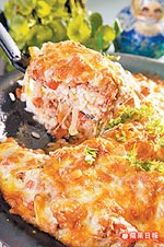 米餅上依序鋪上起司絲、肉醬,再鋪上一層起司絲,以200℃烤7分鐘即可。