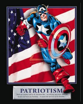 從手上拿著鑲嵌白色星星的紅盾牌、穿著紅白藍色調的服裝,就可以知道美國隊長不愧名為為美國隊長……完完全全一副大美帝主義樣,他,是美國人的精神象徵。